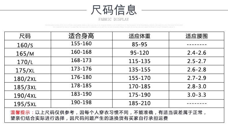 160(S)、165(M)、170(L)、175(XL)、180(XXL)、185(XXXL)、190(XXXXL)