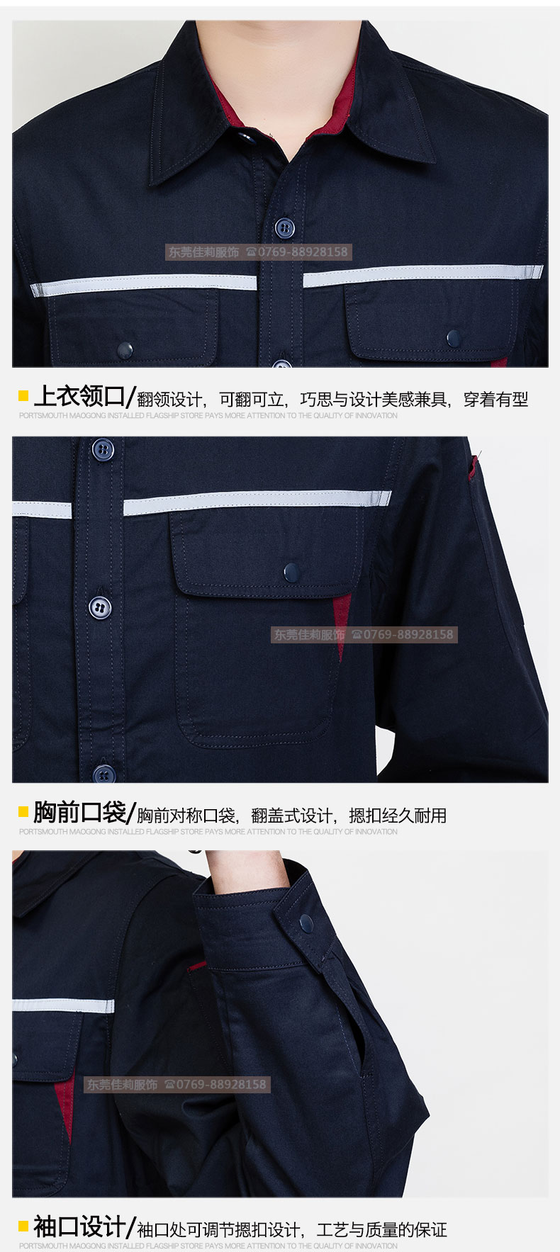 高品質全新形象,經典設計,立體裁剪,時尚翻領,質感有型。走線細致,優質暗扣,實用性強。胸前口袋撞色拼接,雙明線縫制既時尚又耐用,即使在下班之余也可以穿。
